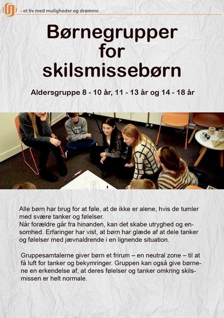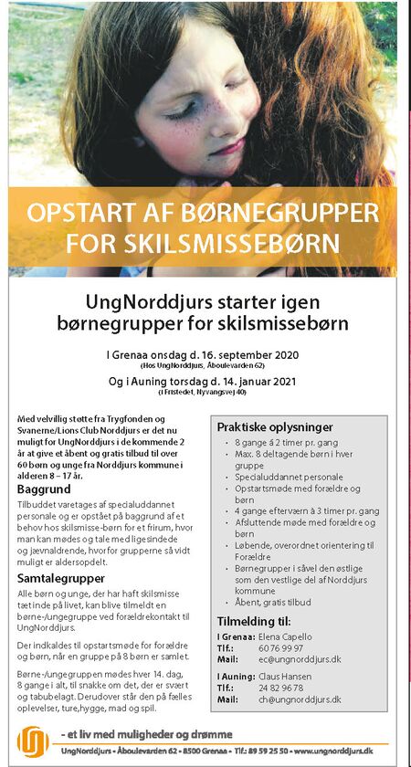 Alle børn og unge, der føler sig klemt i forældrenes skilsmisse, kan fra 1. oktober i år blive tilmeldt en børne-/ungegruppe ved forældrekontakt til UngNorddjurs. Der indkaldes til opstartsmøde for forældre og børn, når en gruppe på 8 børn er samlet.